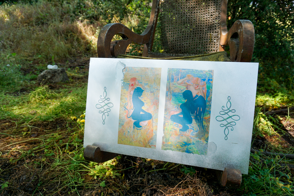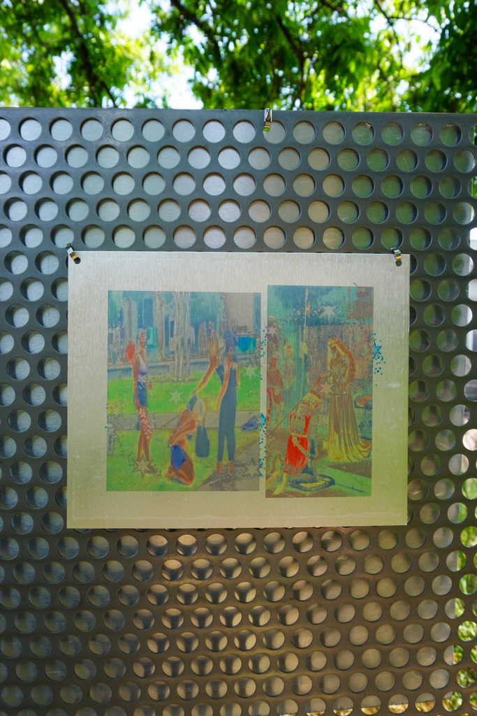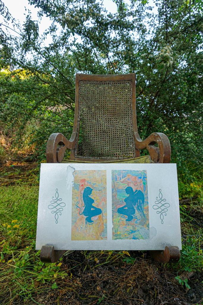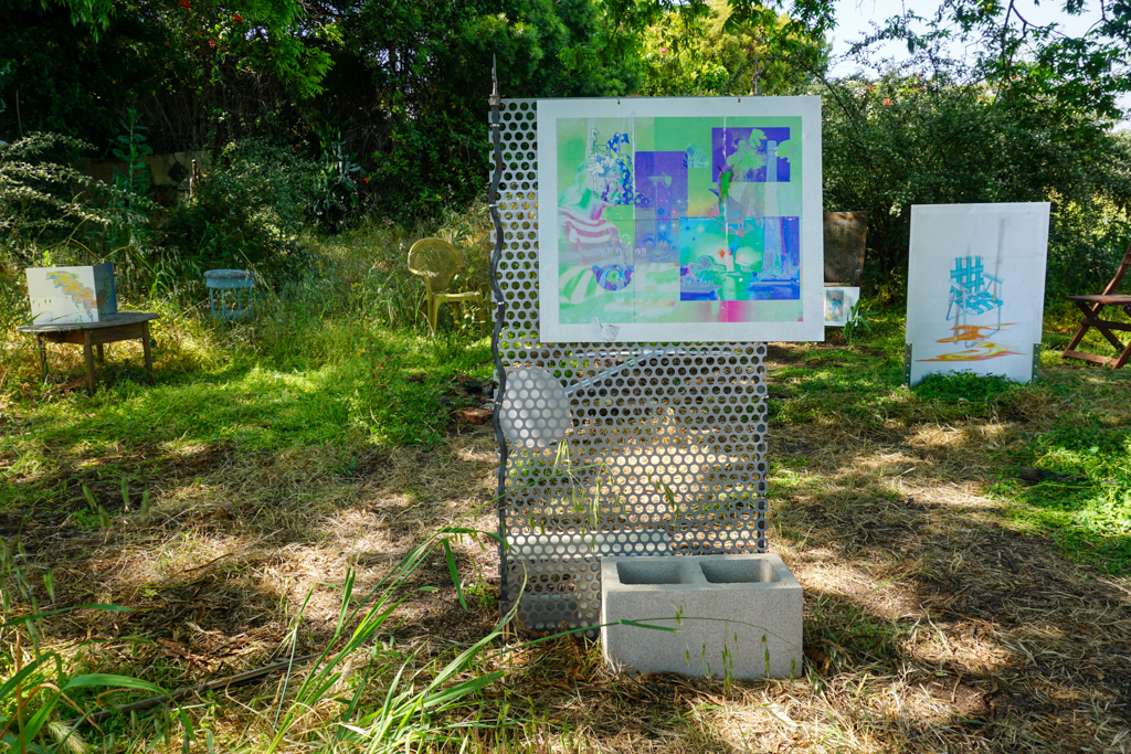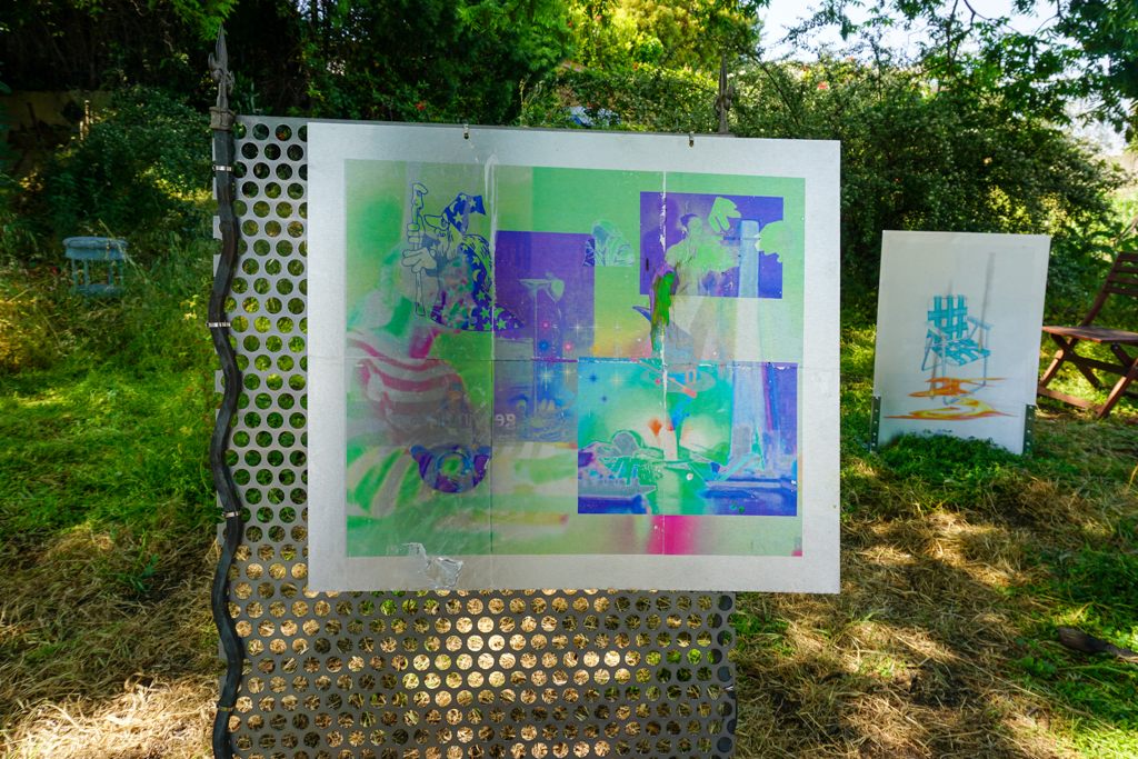 Pulling from one another’s image-horde, the cadavre is passed back-and-forth, activating something like an app-based Third Mind. The resulting images are transferred to metal by means of an analog technique reminiscent of Rauschenberg’s.