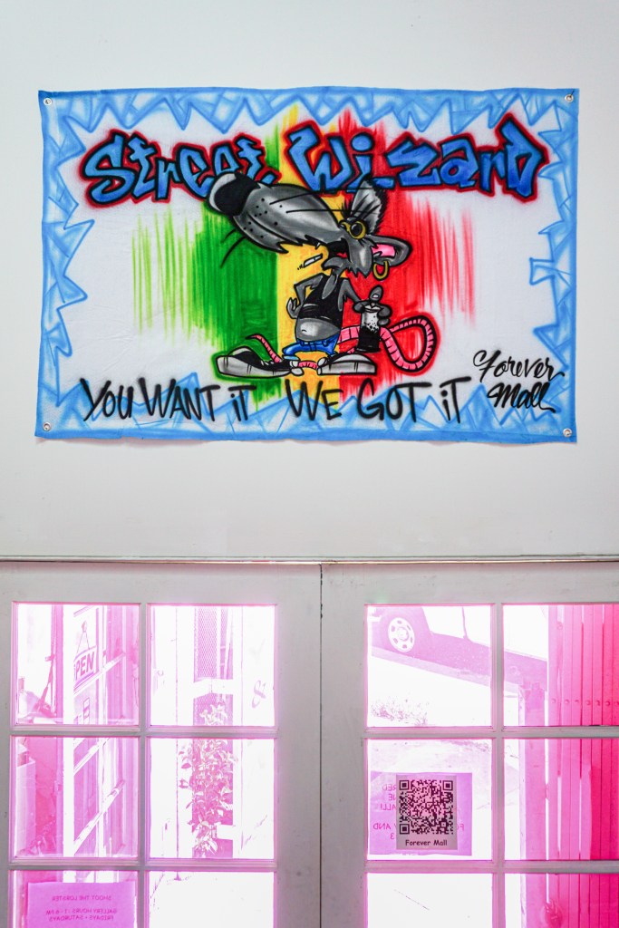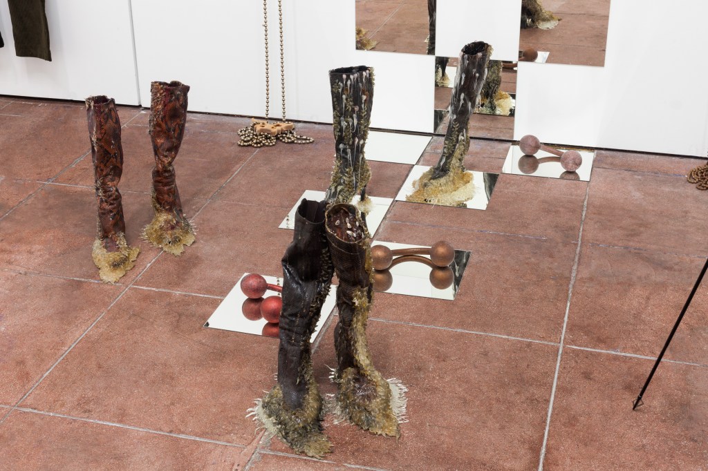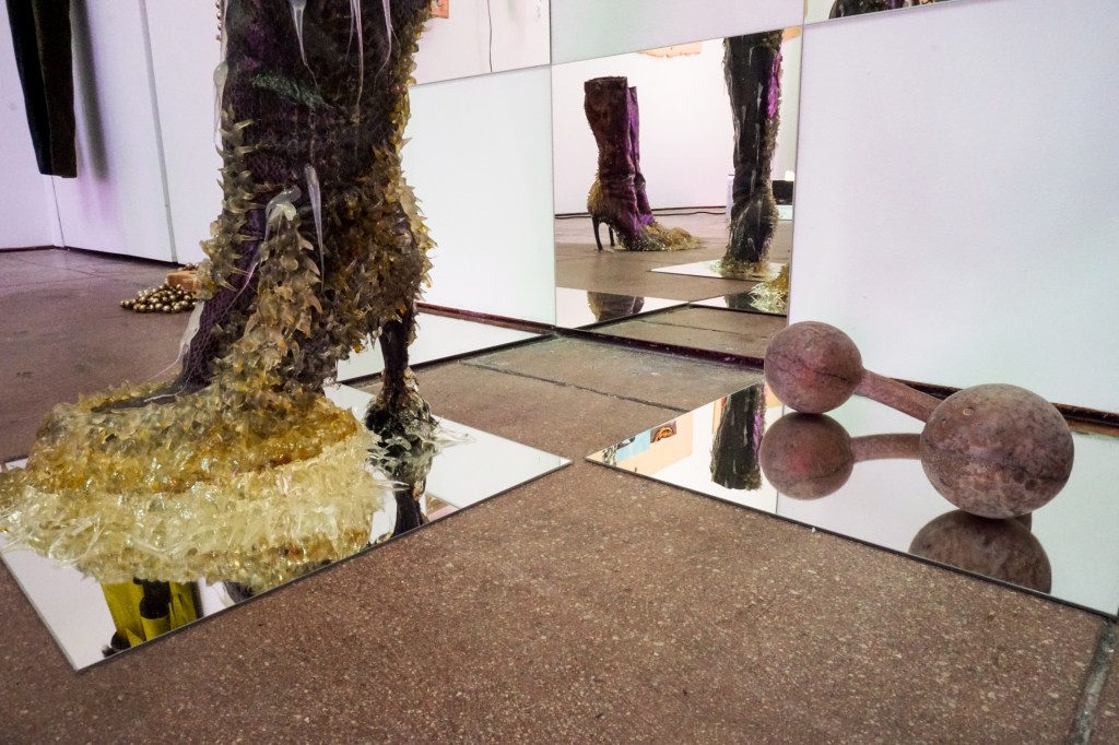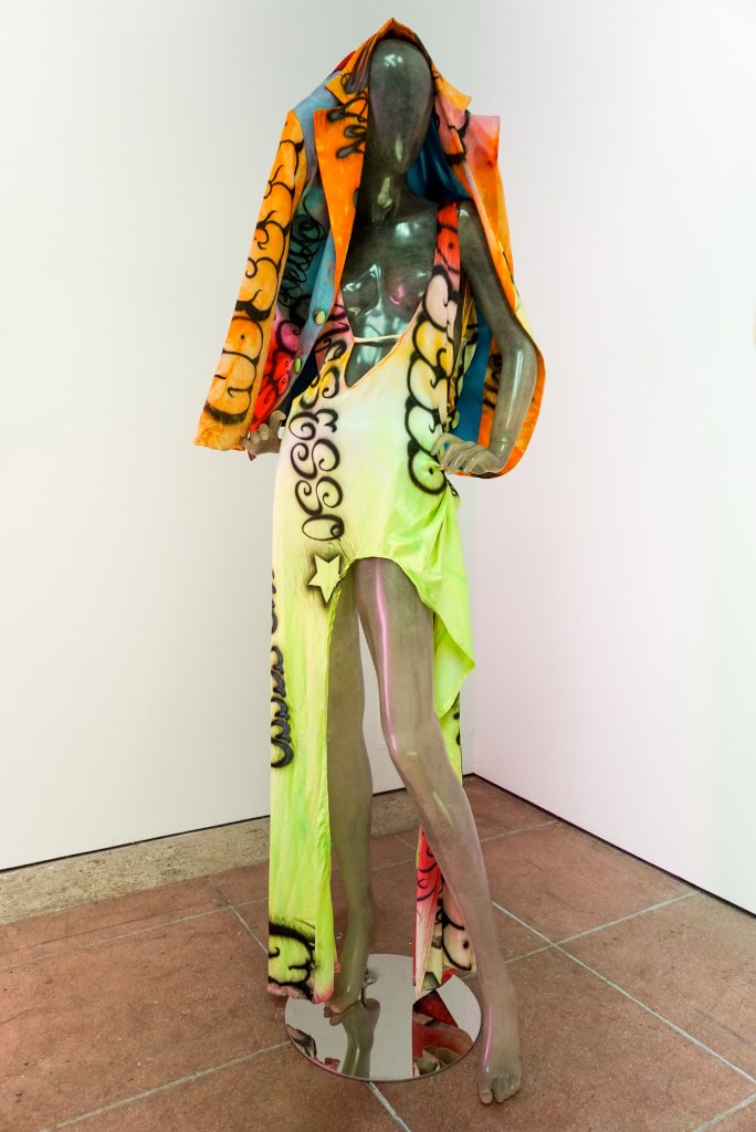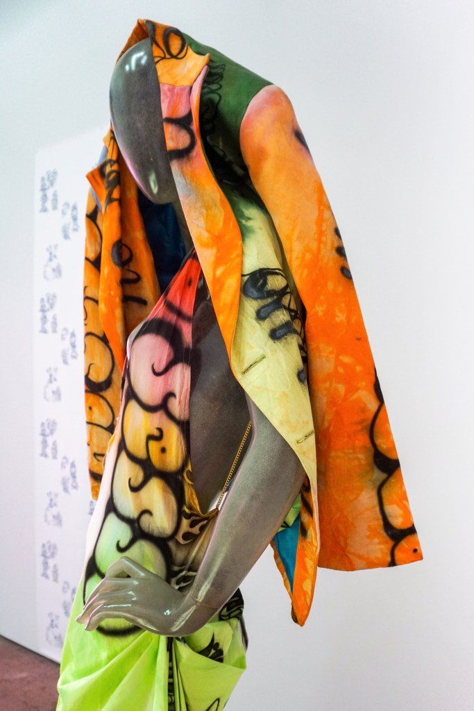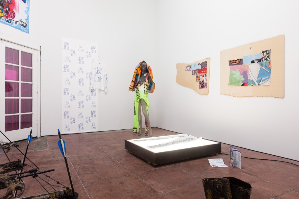 Adorned on a mannequin is archive pieces from the LA-based duo and future facing fashion brand No Sesso, equal parts biker aesthetic, handcrafted airbrush and survivalist style.