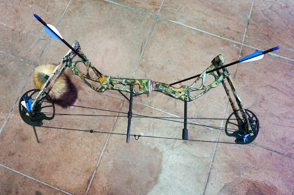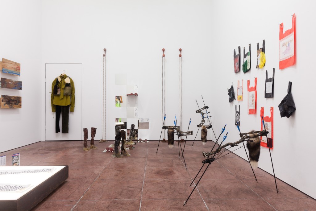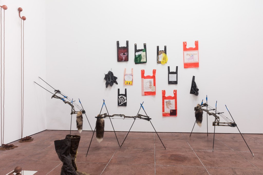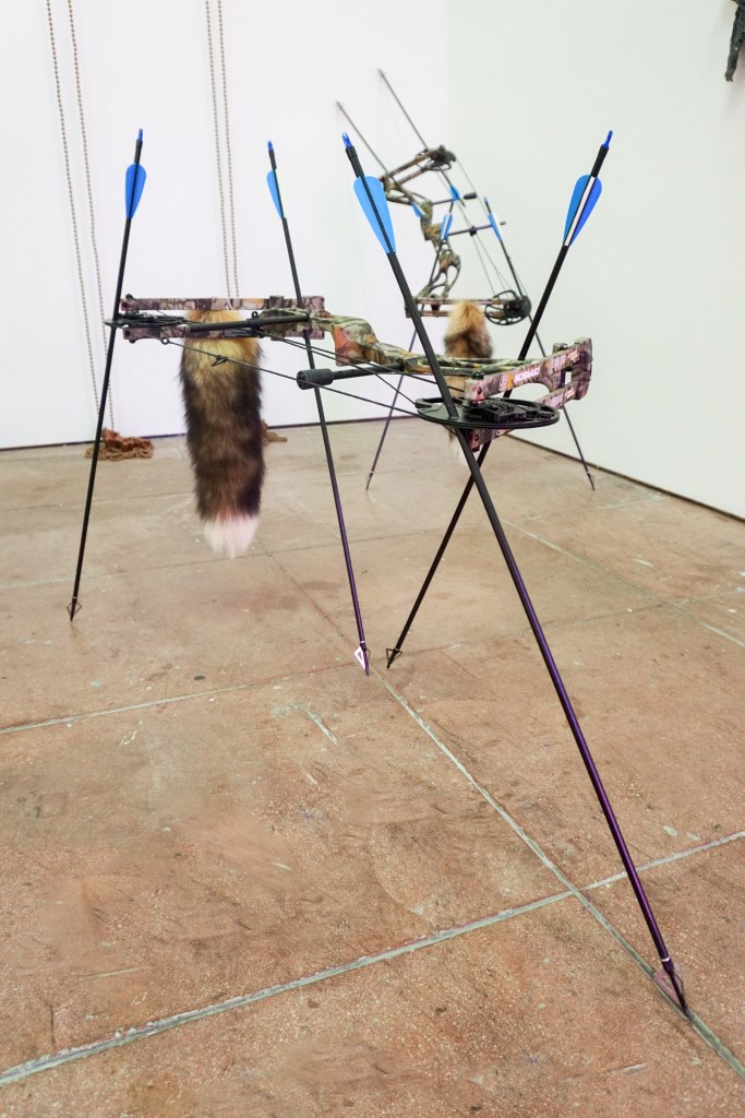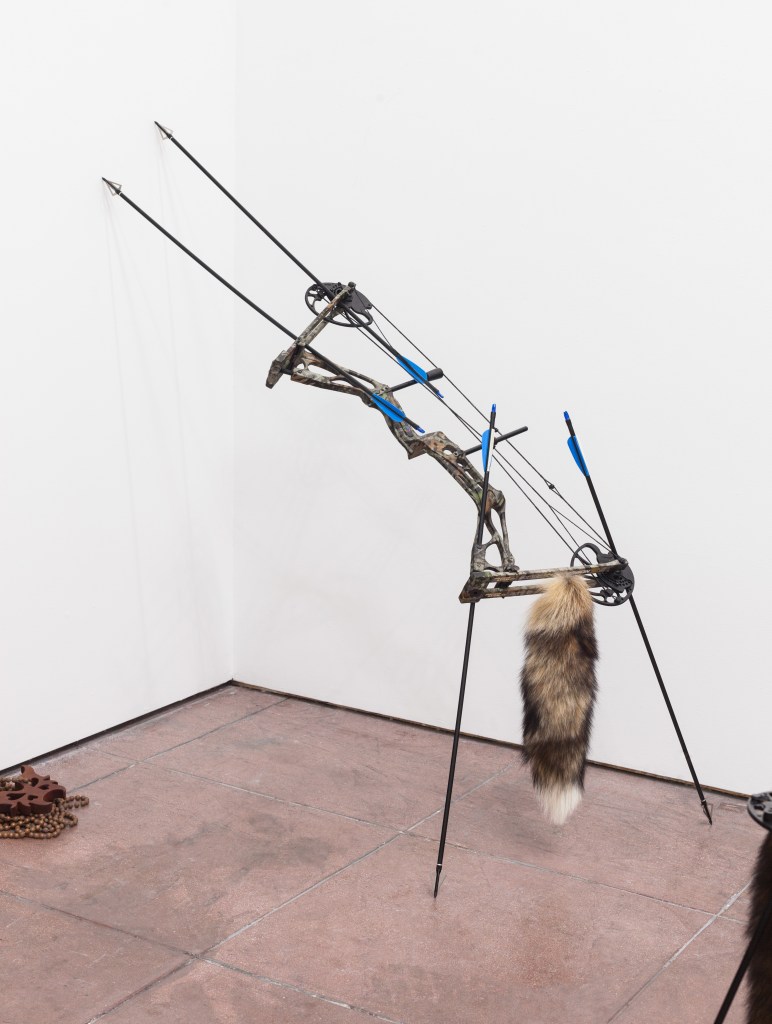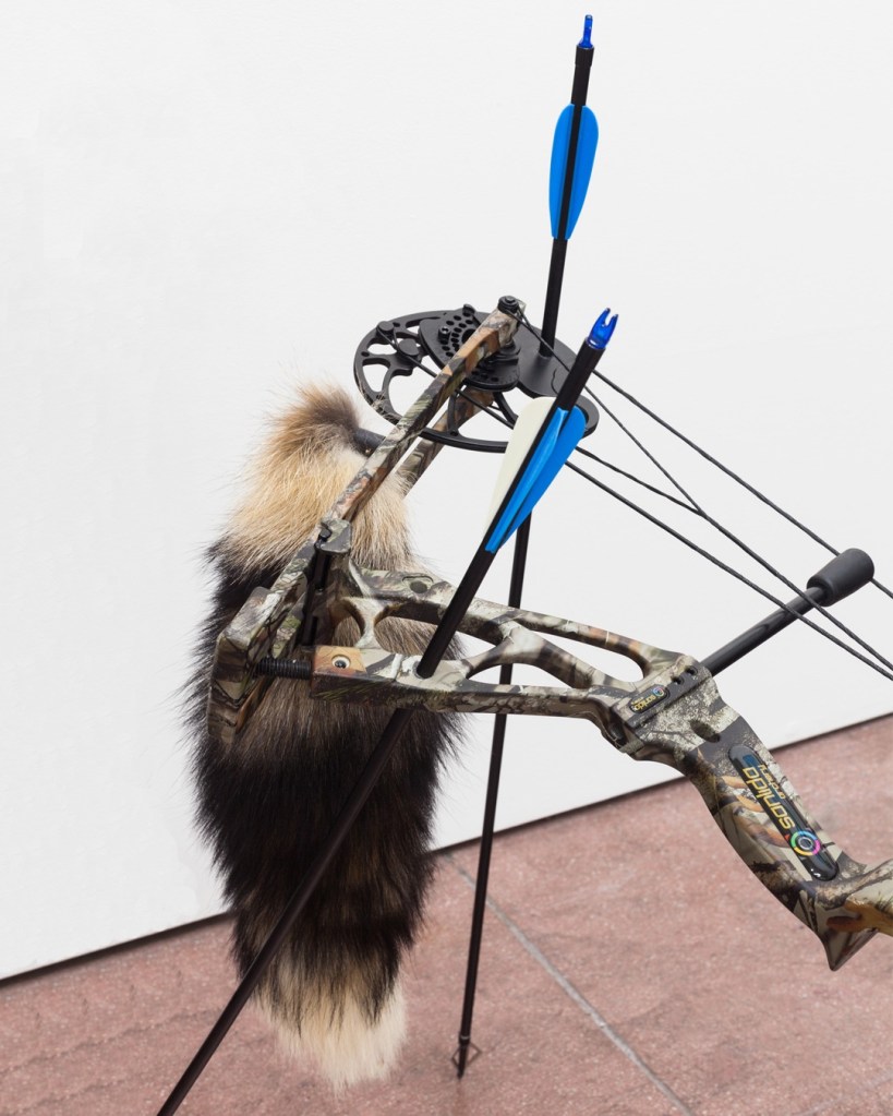 Some of his recent work deals with the disappearance of tangible currencies and for this exhibition he has populated the space with a group of animal-like compound bows. The bow and arrow were once the pinnacle of the barter economy of Hunter-gatherer culture 10,000 B.C. Now it has morphed into its prey.
