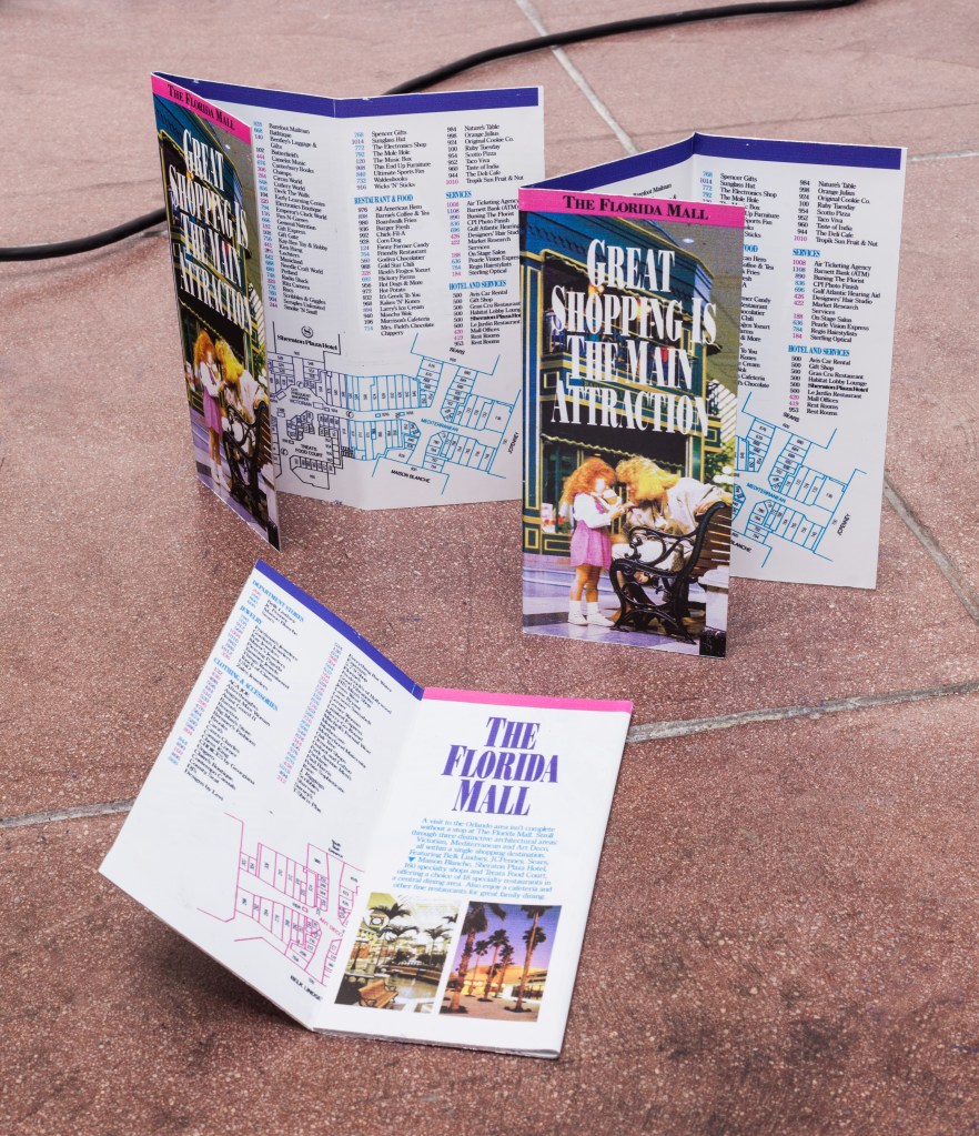 Bolivia-born, Florida-raised artist Agatha Wara presents new sculptures based on a reproduction of a 1989 brochure from the then glorious Florida Mall located in her adolescent hometown of Orlando. 1989 was also the year her and her family left Bolivia in the middle of the country’s worst financial crises to seek a better life in the US. The textile and text piece is adapted from a New York Times article from that same year describing the crippling inflation and economic turmoil in Bolivia.