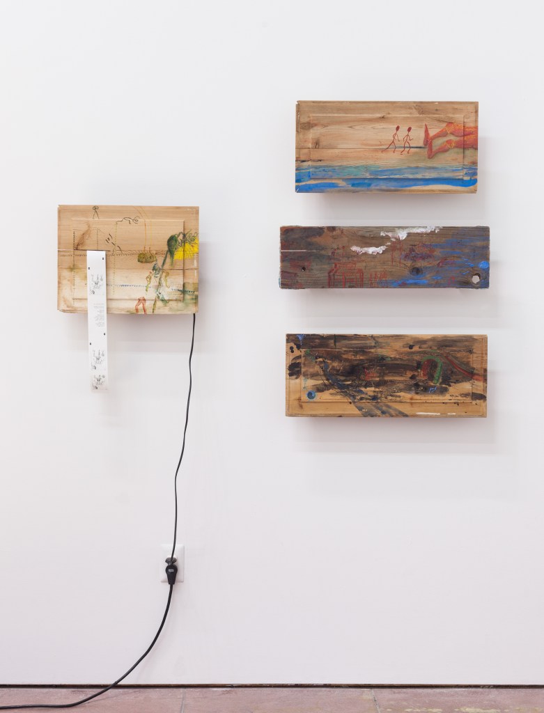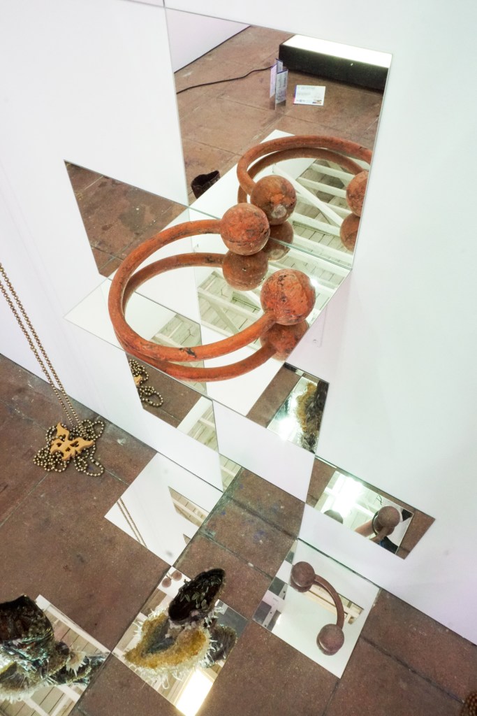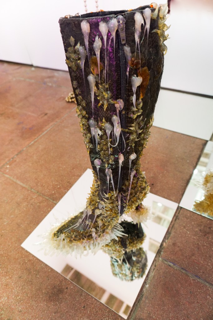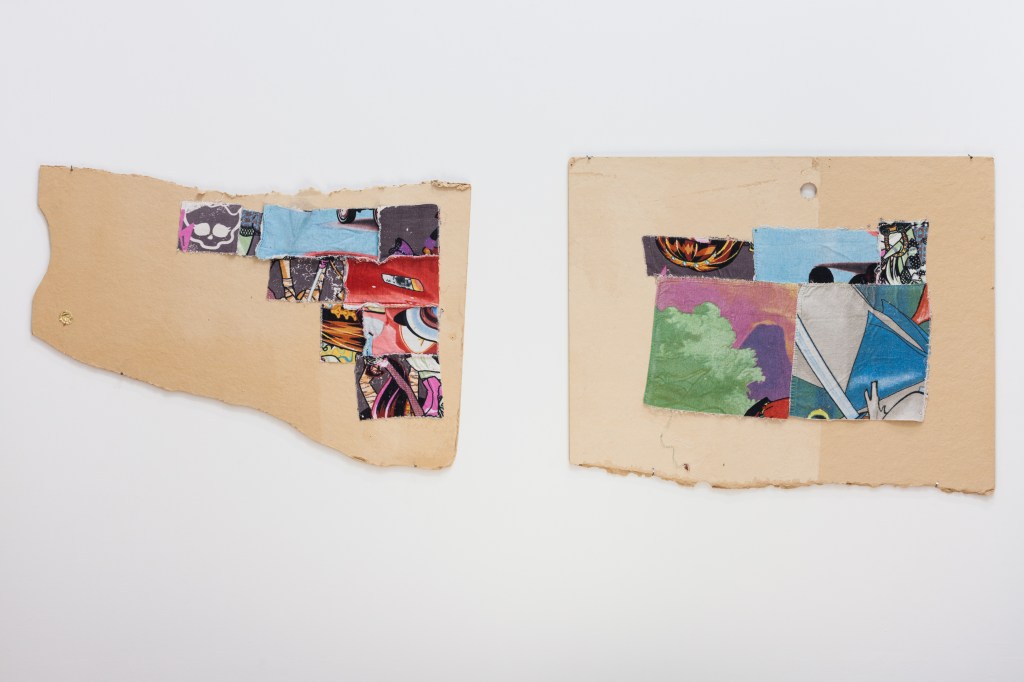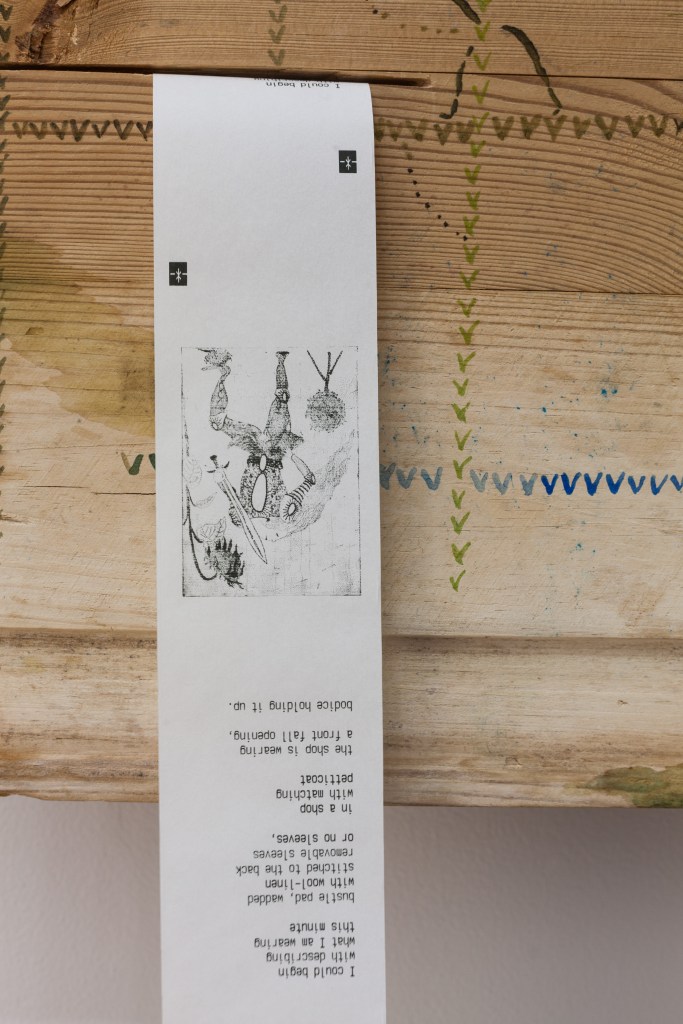 Her work here consists of patchwork pieces of deconstructed franchise beach towels and a repurposed receipt machine she has painted using motifs and figures from her fashion research. Rather than tallying up your order, this instrument rings out a poem along with a rasterized version of a copper etching she made.