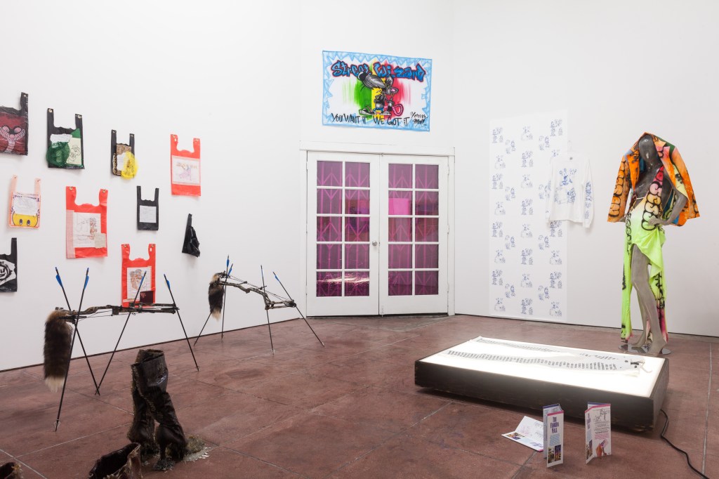 Above hangs a custom-tailored green suit made for the fictitious Robin Hood-esque Julian Luxford; the artist’s alter ego. Luxford and his image is currently disseminating through merch, larger than life blow up dolls and banners at the up-scale department store Magasin Du Nord in Copenhagen’s central square.