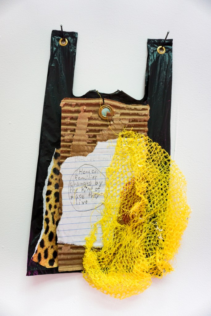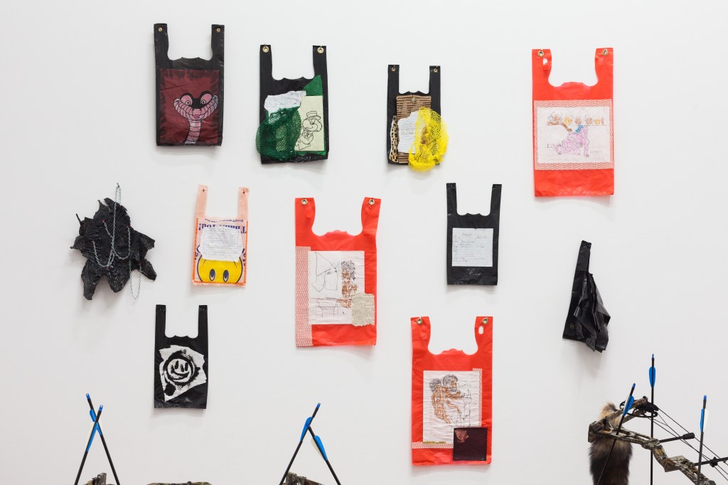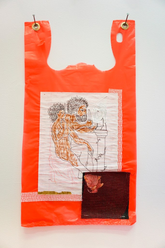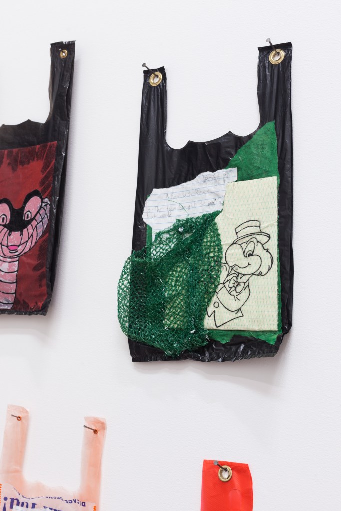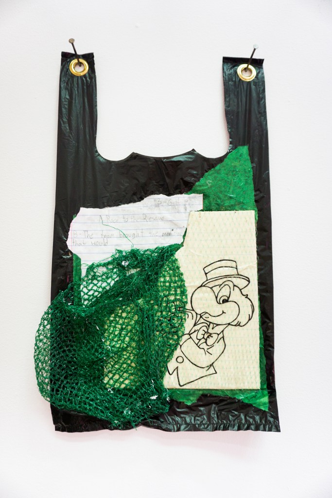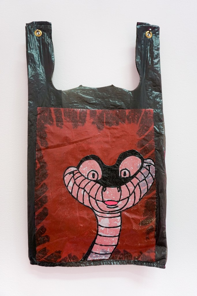 Philly-based artist Ginssiyo Apara has spent the last couple of years repurposing plastic shopping bags and trash-bags as his preferred canvas. On these throw-away and ubiquitous objects he paints and collages everyday tableaus, blending seemingly harmless childhood cartoon characters with more serious messaging.
