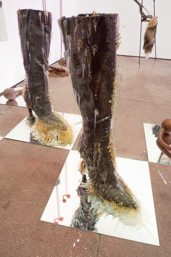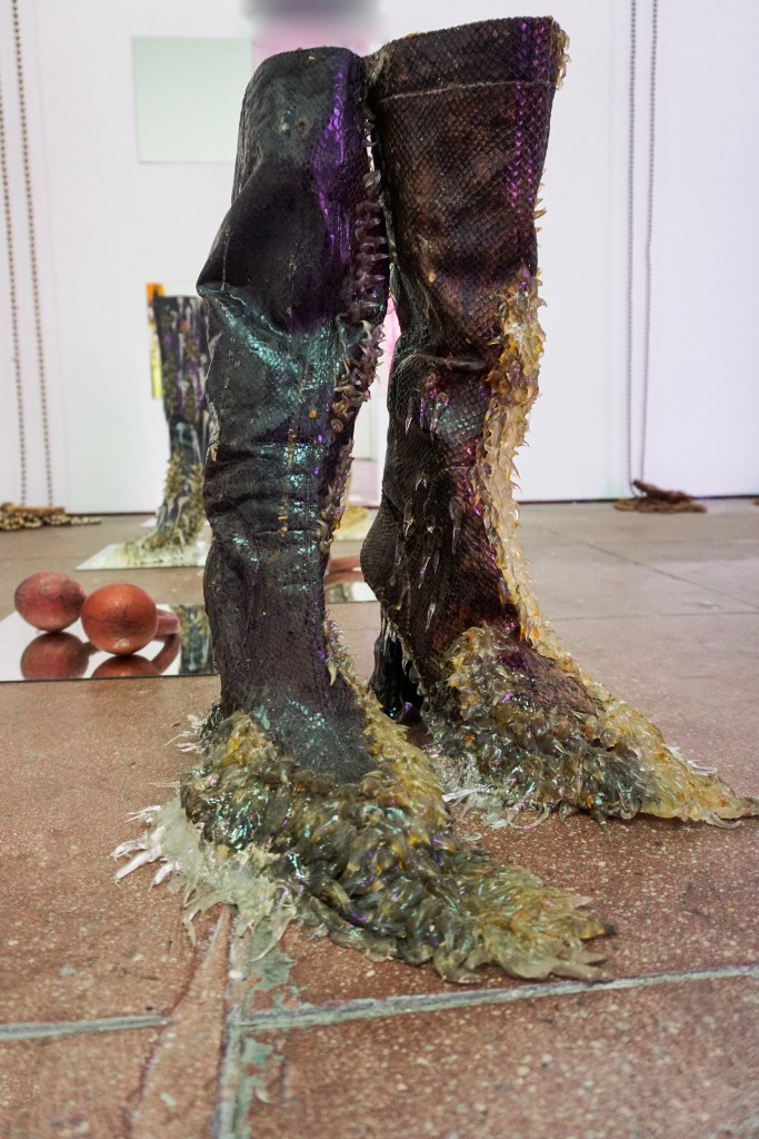 Sessa Englund’s sculptures live somewhere between function and myth. Many of her works resemble everyday crafty and highly aestheticized vernacular design, mixed with snakeskin boots and oversized piercings, small troll tokens and large latex beast-like skin. Her work has a folklorish familiarity to it, reexamining our relationship with everyday objects that may be more queer than we notice at first glance.