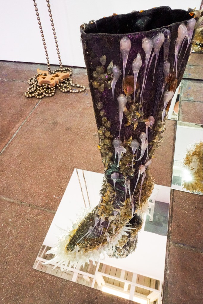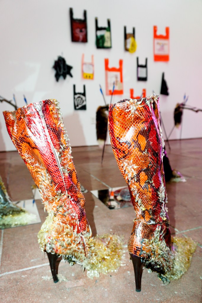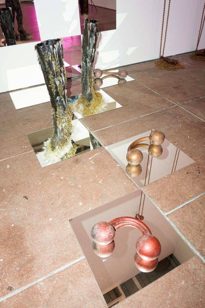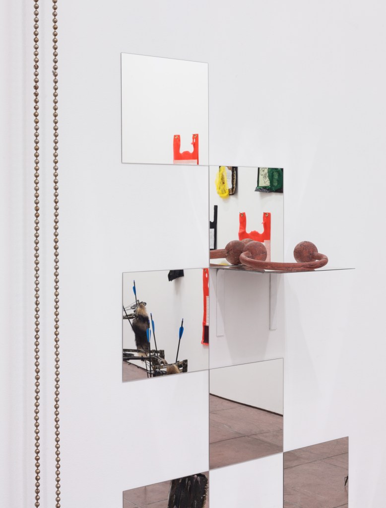 Forever Mall presents a group of works that deal with shopping culture, waste, bling, strip mall paraphernalia and the seductive pull of a highly mediated event economy. The space has a low-fi mise-en-scene vibe, like an abandoned shop-in-shop unit, where mall driftwood, precious and personalized commodities, and future-like nostalgia blend together.
