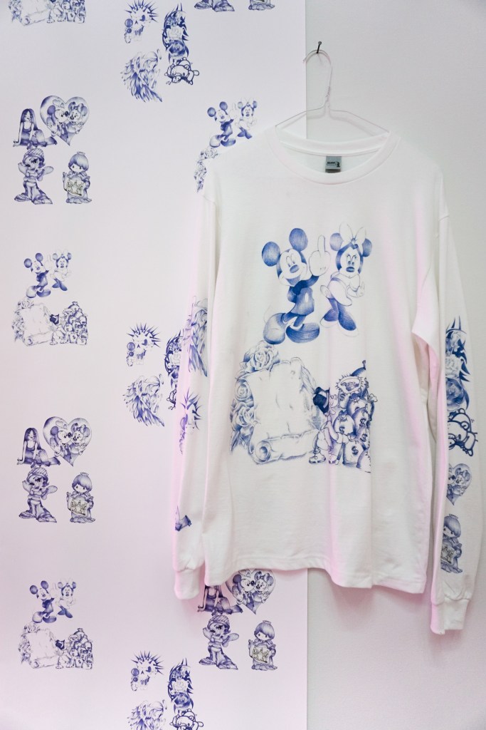 Valentina Vargas based in San Francisco has lent her talent in ballpoint pen drawings to a wallpaper size piece and matching sweater featuring familiar iconography and kids in exciting outfits. Depicting different fashion styles in her imagery, one is easily transported to the teenage memory of trying out new looks and identities at the local shopping mall.
