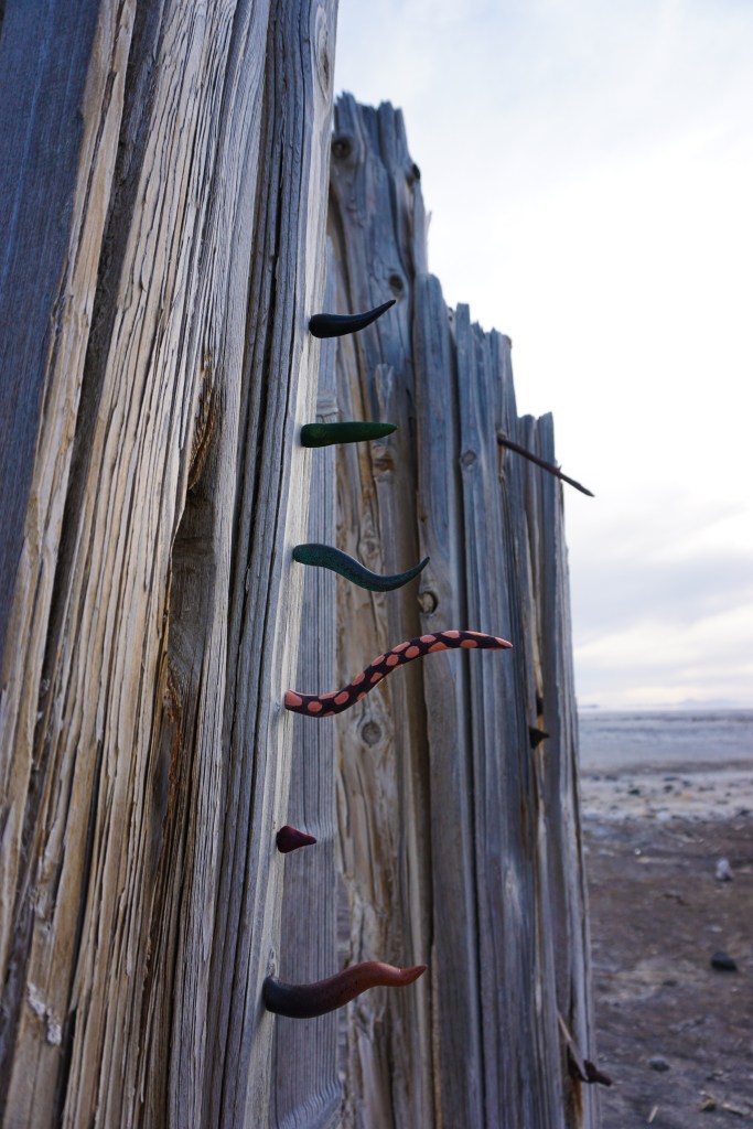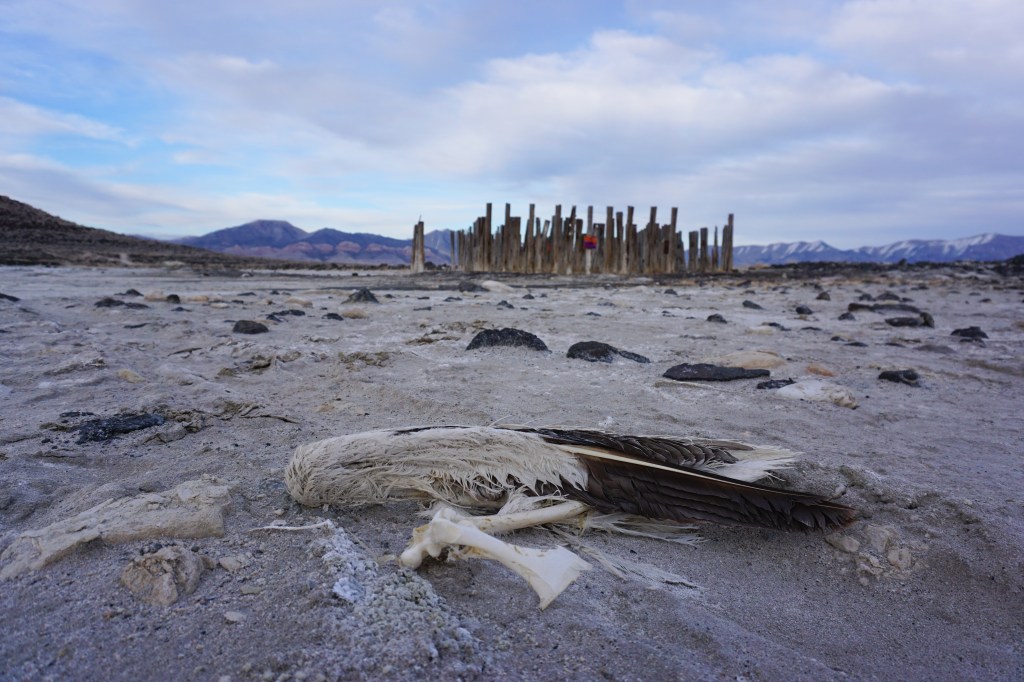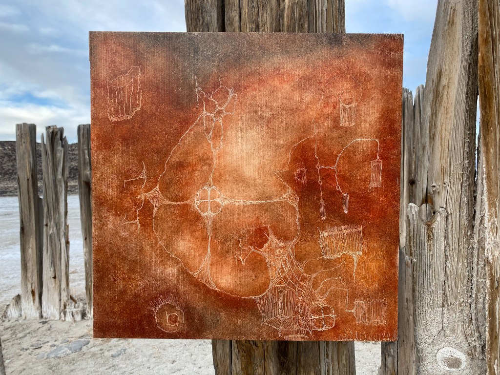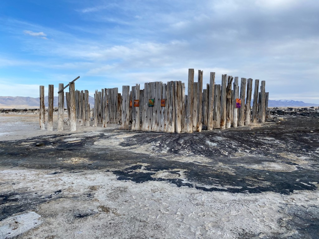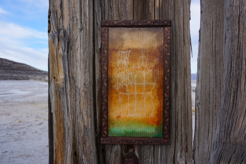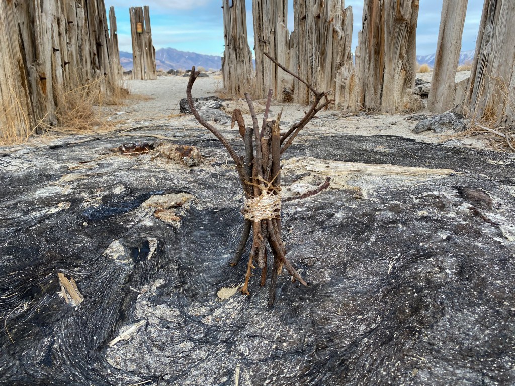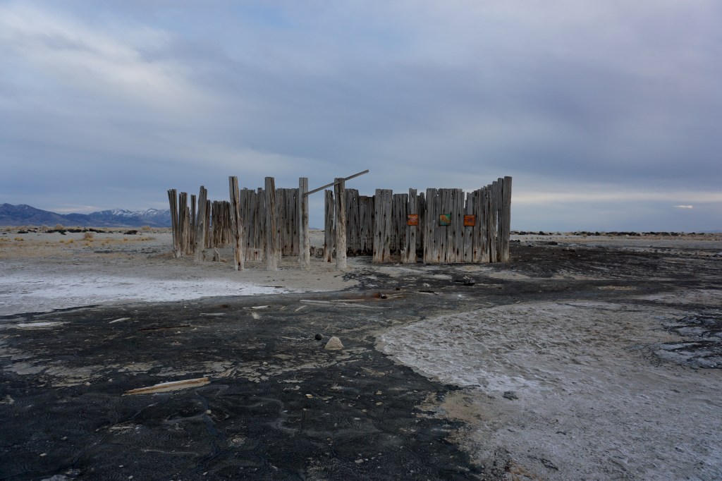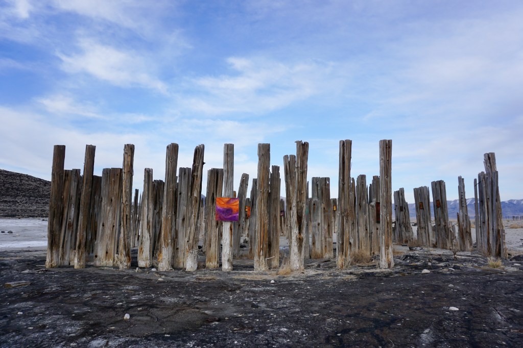 A fort-like, roofless structure juts out from the flat saline sands, situated about 150 yards south of the large hill that once spewed lava, then tumbled itself down, lower and lower, kissing the earth with as many spreading and dividing grains as possible. The nimble lake waves used to lap against it, but have crawled further and further away for four decades now. The fort stands at the foot of the flattening hill, the shoreline of the evaporating lake, and sits as the source of fossil liquid. It is the eye of the slowest storm. The wood grains of the structure have sunken and puckered. Seeping oil moves even slower than the ever-receding shoreline, determined to make a thick, cursed, black lake of its own. Bodies slowly chase and bind each other between seasonal tides as the hexed structure peers from between pillars at each of their shared, shallow, raspy breaths as the sun runs down the lake’s throat.