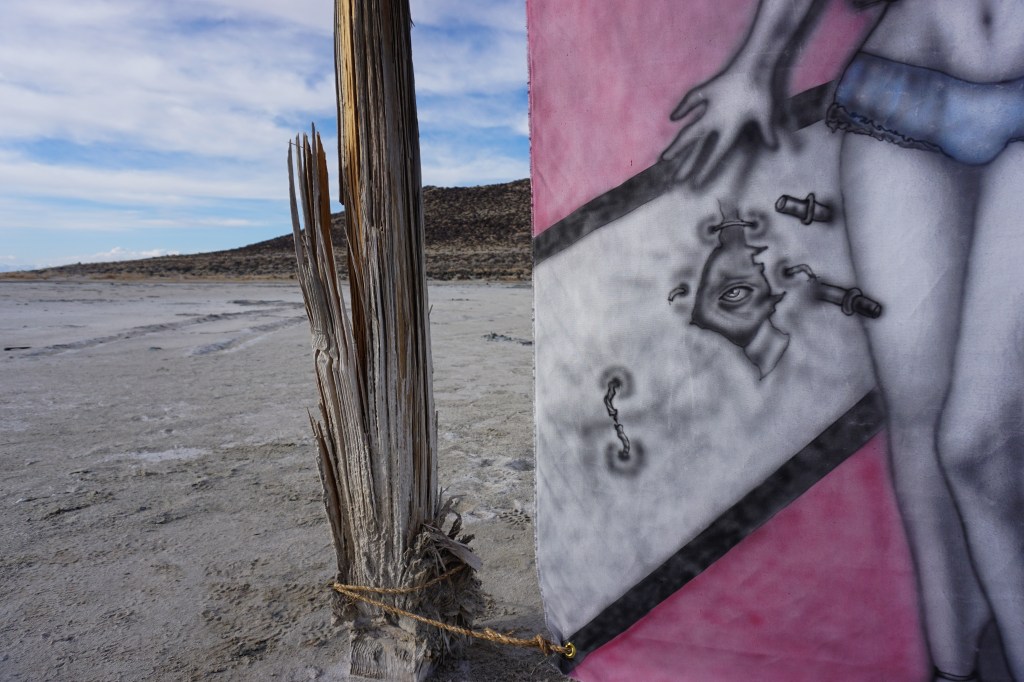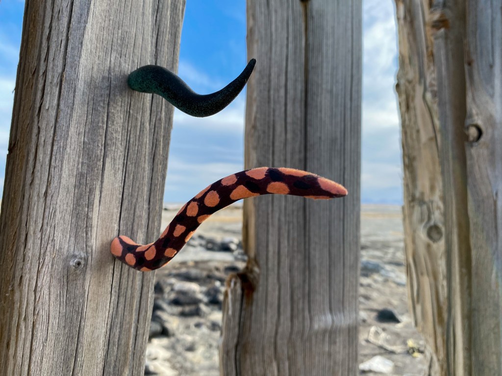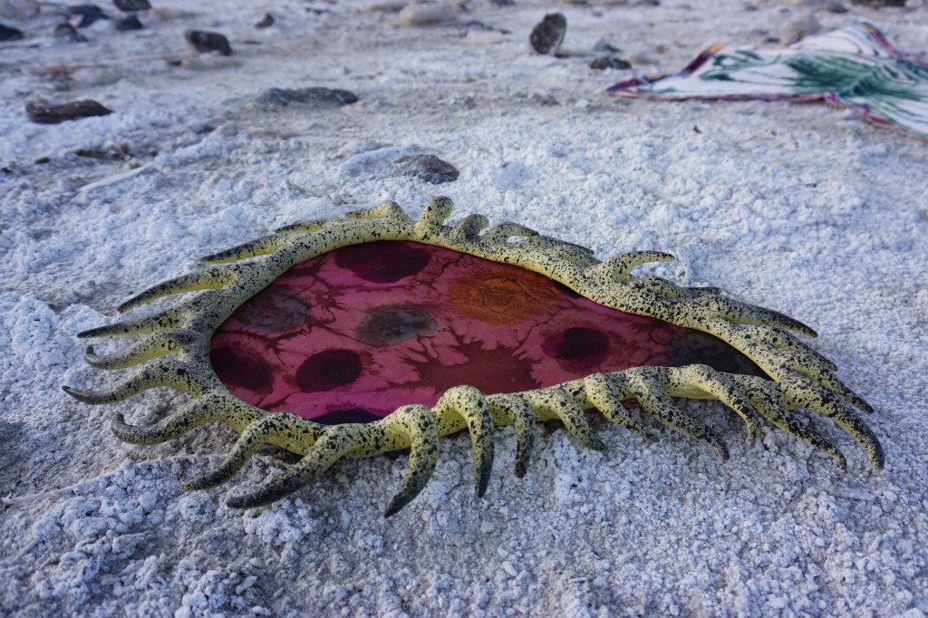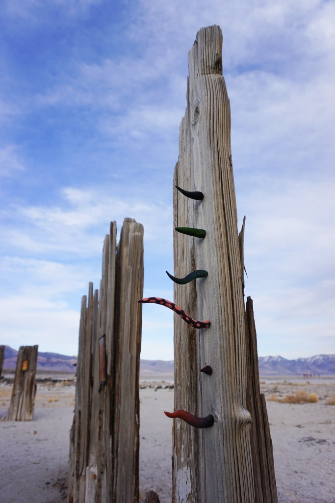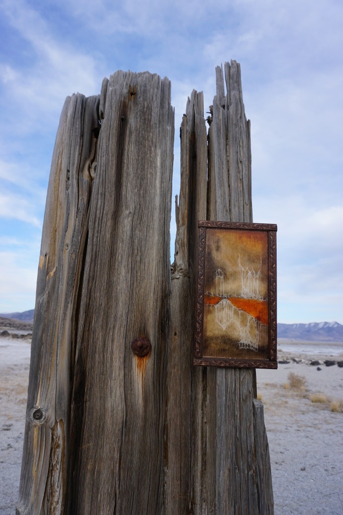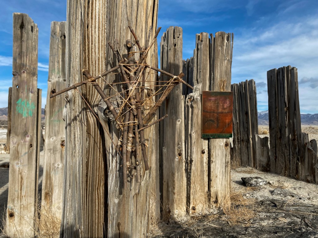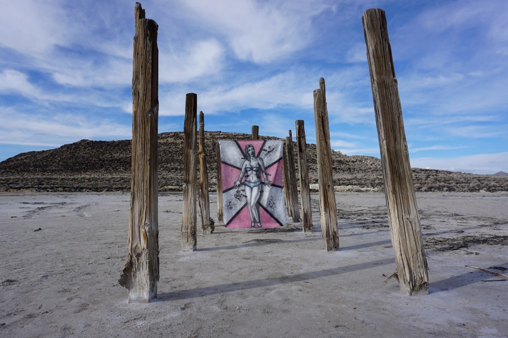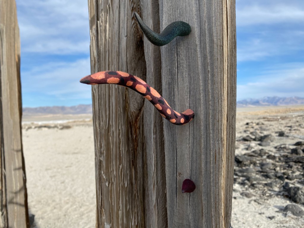 A fort-like, roofless structure juts out from the flat saline sands, situated about 150 yards south of the large hill that once spewed lava, then tumbled itself down, lower and lower, kissing the earth with as many spreading and dividing grains as possible. The nimble lake waves used to lap against it, but have crawled further and further away for four decades now. The fort stands at the foot of the flattening hill, the shoreline of the evaporating lake, and sits as the source of fossil liquid. It is the eye of the slowest storm. The wood grains of the structure have sunken and puckered. Seeping oil moves even slower than the ever-receding shoreline, determined to make a thick, cursed, black lake of its own. Bodies slowly chase and bind each other between seasonal tides as the hexed structure peers from between pillars at each of their shared, shallow, raspy breaths as the sun runs down the lake’s throat.